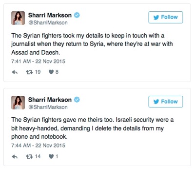 Шари Марксън заяви, че над 500 от тях са членове на ал-Кайда и са ранени по време на сраженията в Сирия. Марксън е успяла да запише подробности за начина, по който те са били транспортирани до израелската болница, а след това са изпращани обратно да продължат джихада в Сирия. След това журналистката била арестувана от служители по сигурността.